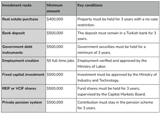 Turkey offers seven qualifying investment routes, giving applicants flexibility based on their goals, liquidity preferences, and long-term plans.
